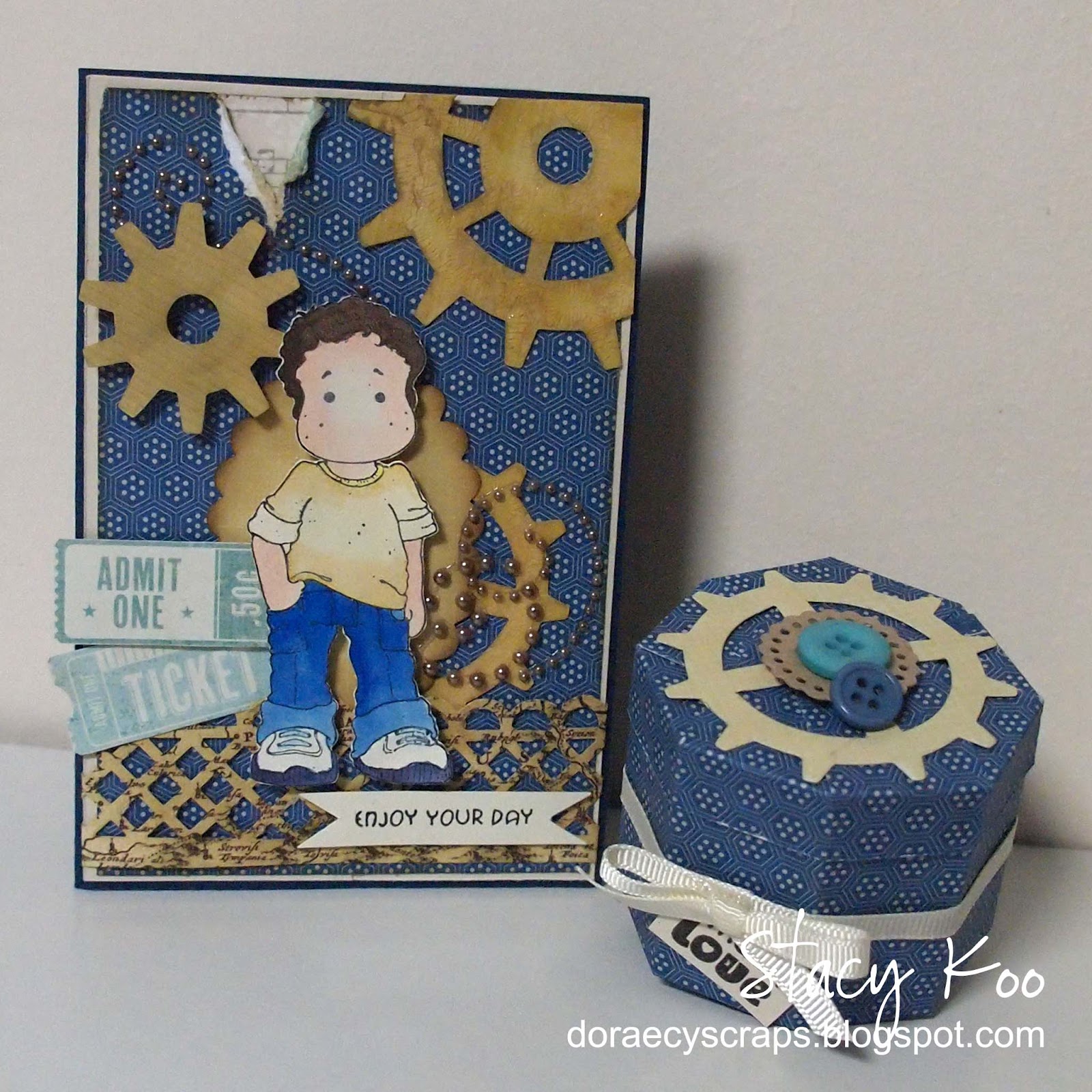 Decided on a card set, since it was really rare that I made use of a color so deep. The box is a 8-sided hexagonal box, made from the very same pp of the card. The gears went through distressing and crackle paint for an aged effect. Cards for guys just ain't easy to manage!